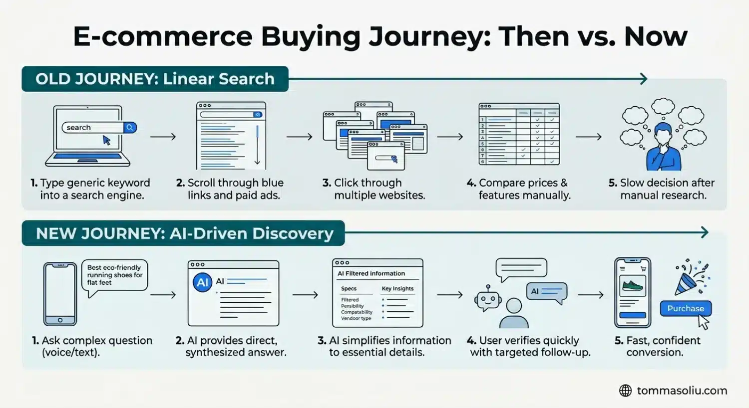 | Before (Traditional Ecommerce Journey) | Now (AI-Driven Product Discovery) |